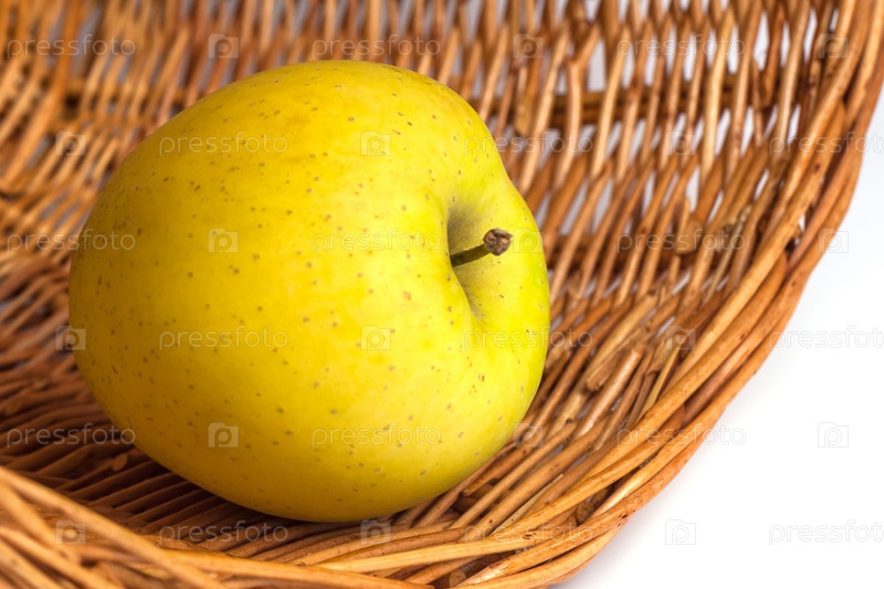 Яблоко в плетеной корзине на белом фоне