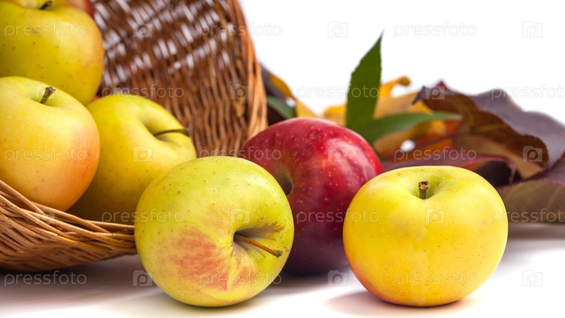 Яблоки в плетеной корзине на белом фоне