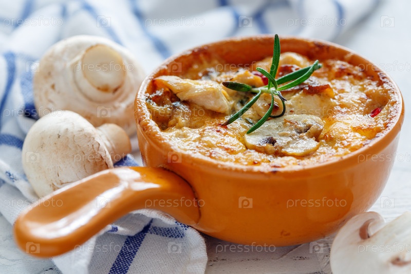 Глинный горшок с жареными грибами, курицей и сыром