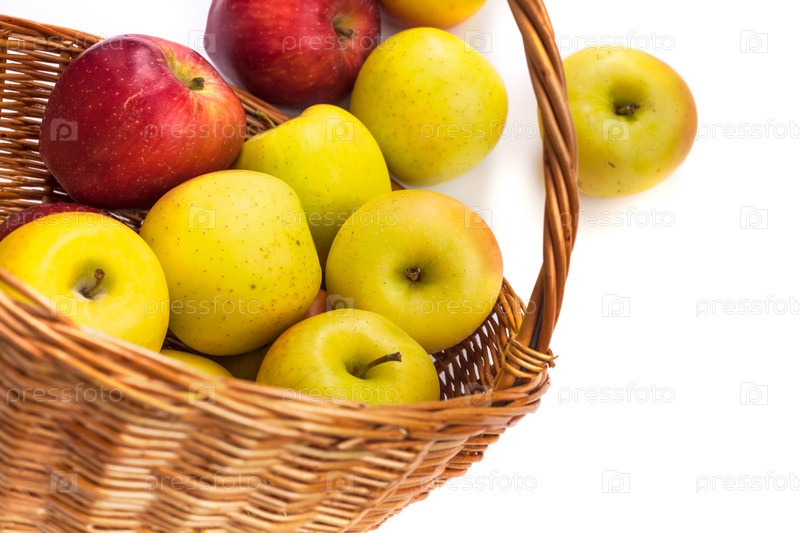 Яблоки в плетеной корзине на белом фоне