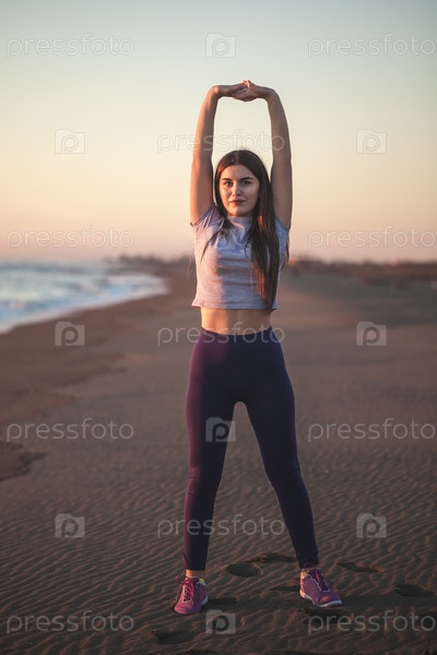 Красивая молодая женщина делает упражнение на песчаном пляже