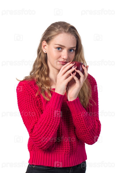 Блондинка с красным яблоком в руке, на белом фоне