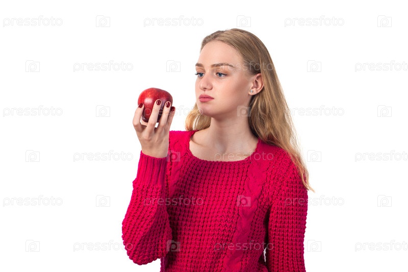 Блондинка с красным яблоком в руке, на белом фоне