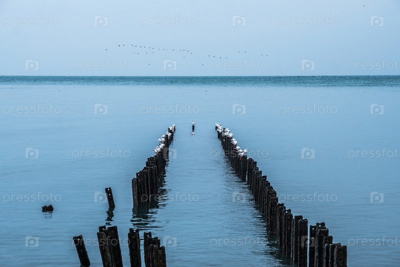 Чайки на волнорезе Черного моря, Поти, Грузия