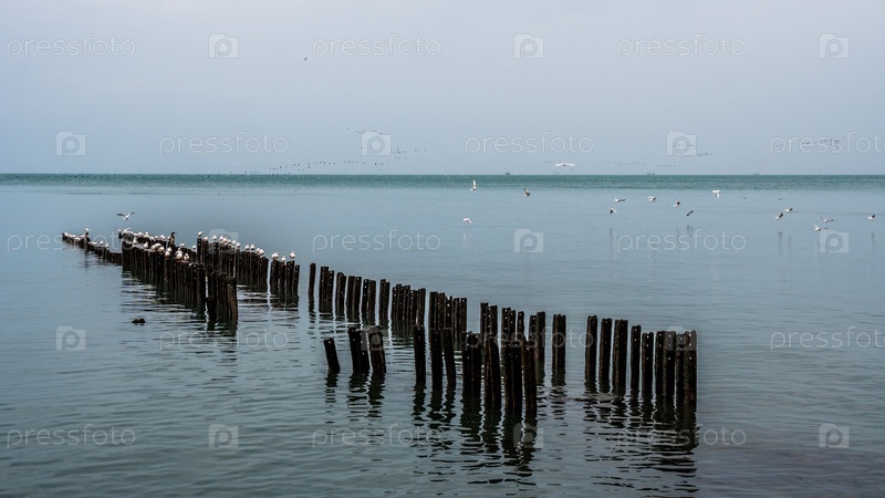 Чайки на волнорезе Черного моря, Поти, Грузия