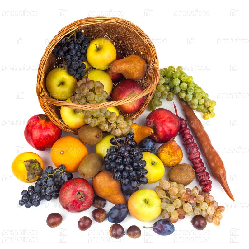 Фрукты в плетеной корзине на белом фоне