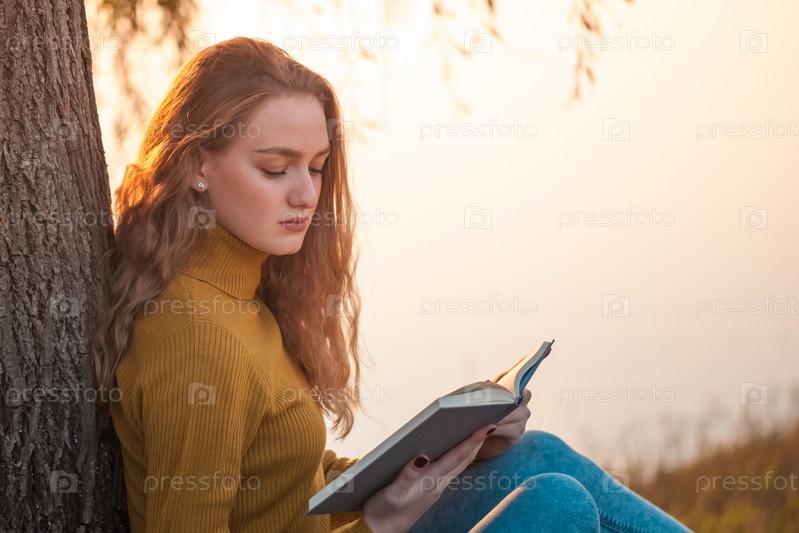 Красивая молодая блондинка читает книгу в парке возле озера