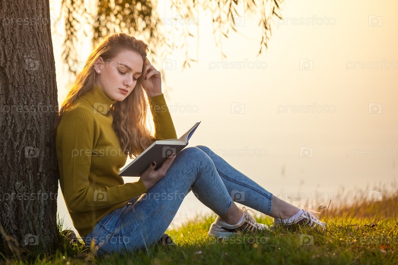 Красивая молодая блондинка читает книгу в парке возле озера