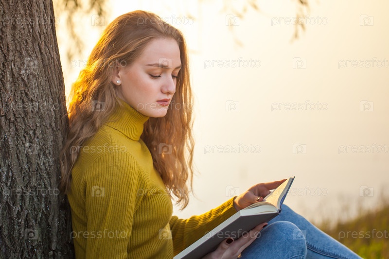 Красивая молодая блондинка читает книгу в парке возле озера