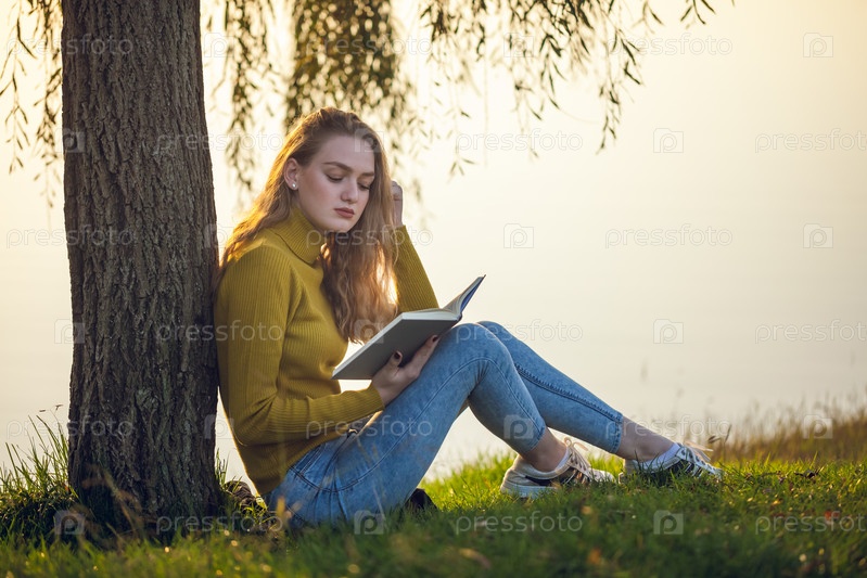Красивая молодая блондинка читает книгу в парке возле озера