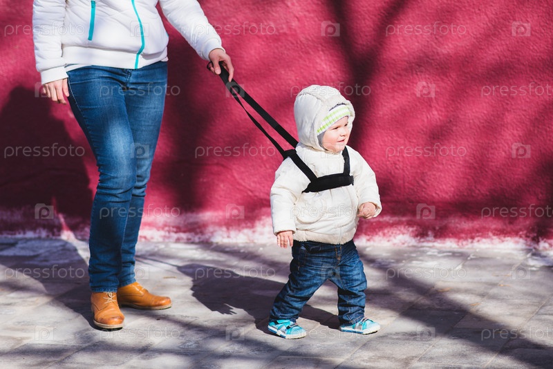 Мама страхует ребенка во время прогулки