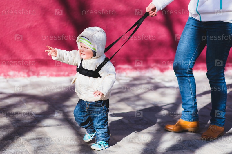 Мама страхует ребенка во время прогулки