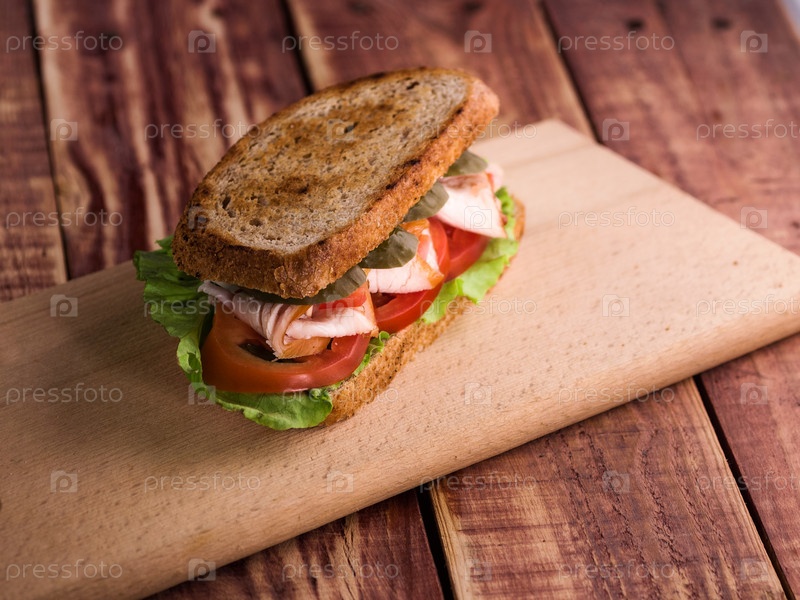 Сэндвич с ветчиной, сыром, помидорами, листьями салата