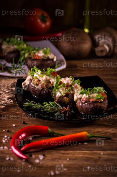 Запеченные шляпки грибов фаршированные с колбасой, сыром и специями