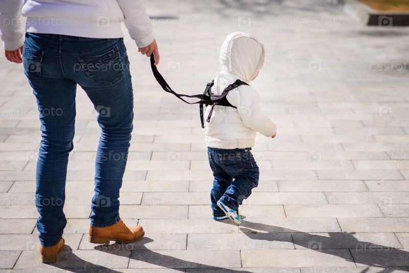 Мама страхует ребенка во время прогулки