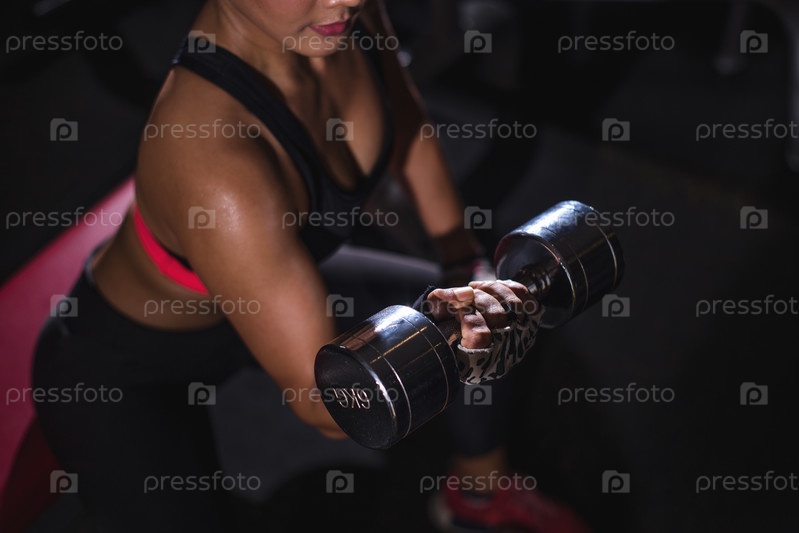 Сильная женщина поднимает гантели в тренажерном зале