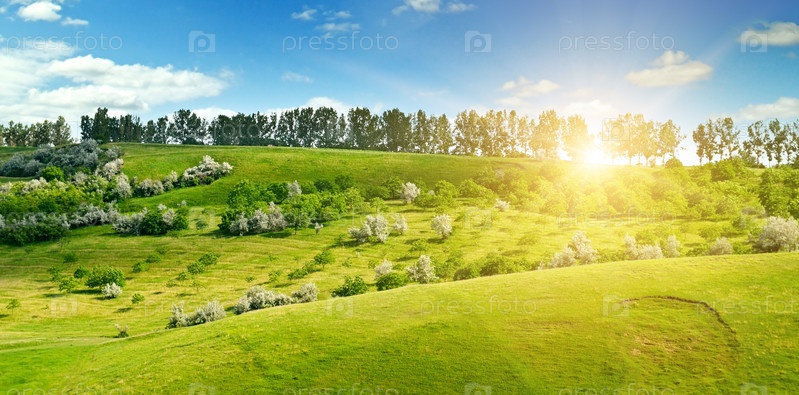 Холмистая зеленые поля и солнце на голубом небе