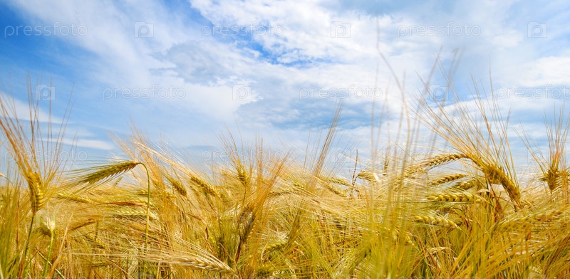 Поле с спелыми колосьями пшеницы и голубое небо
