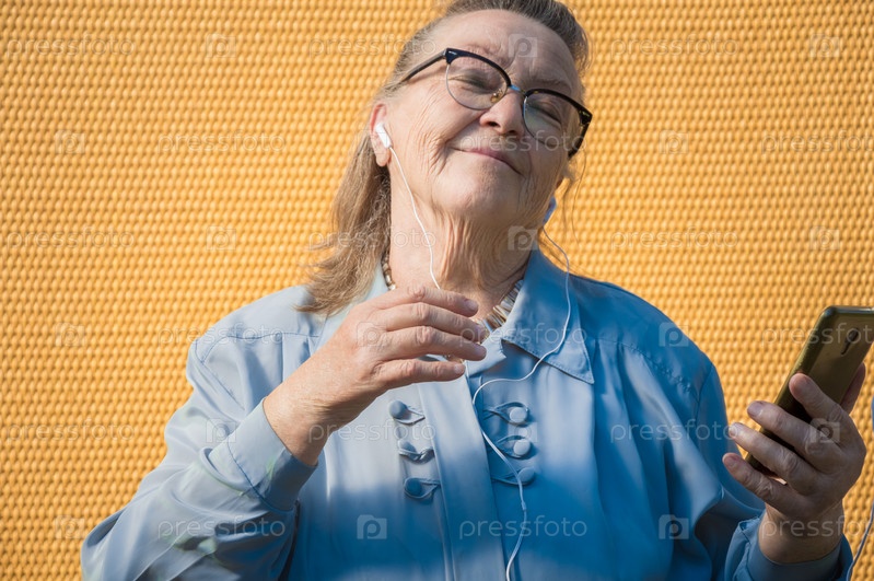Портрет старушки с телефоном и наушниками