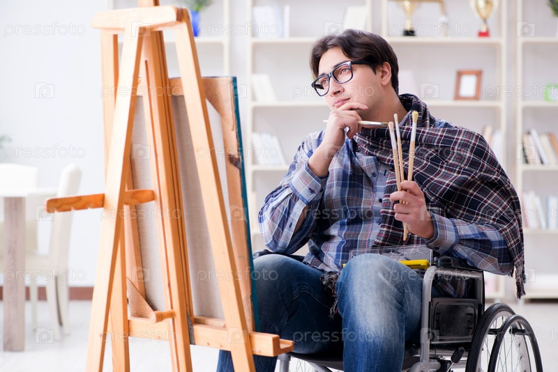 Художник-инвалид рисует картину в студии