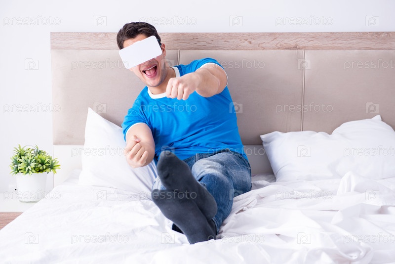 Молодой человек в постели, носящий VR-головной аппарат виртуальной реальности