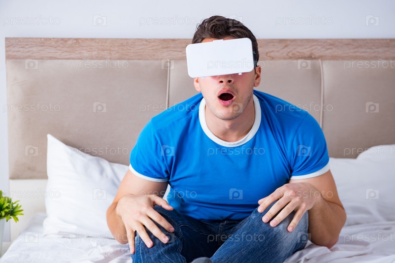 Молодой человек в постели, носящий VR-головной аппарат виртуальной реальности