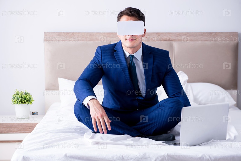 Бизнесмен, носящий гарнитуру виртуальной реальности в спальне