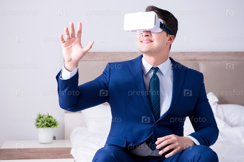 Бизнесмен, носящий гарнитуру виртуальной реальности в спальне