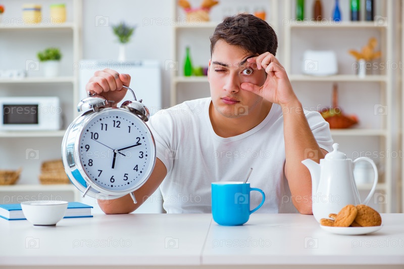 Человек с будильником, который засыпает на завтрак