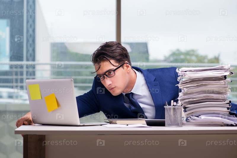 Бизнесмен-работохолик перегружен работой с слишком большим количеством работы в офисе