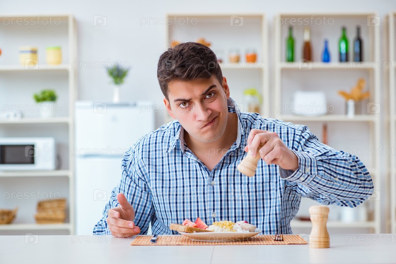 Молодой муж ест безвкусную пищу дома на обед
