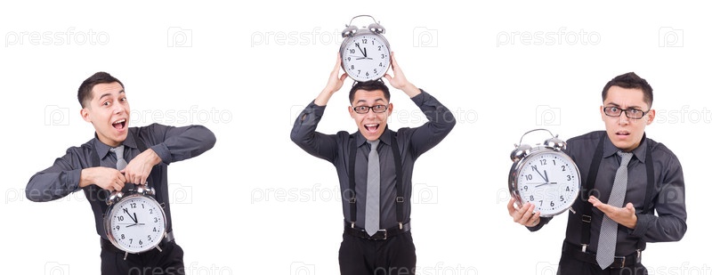 Забавный бизнесмен с часами, изолированными на белом