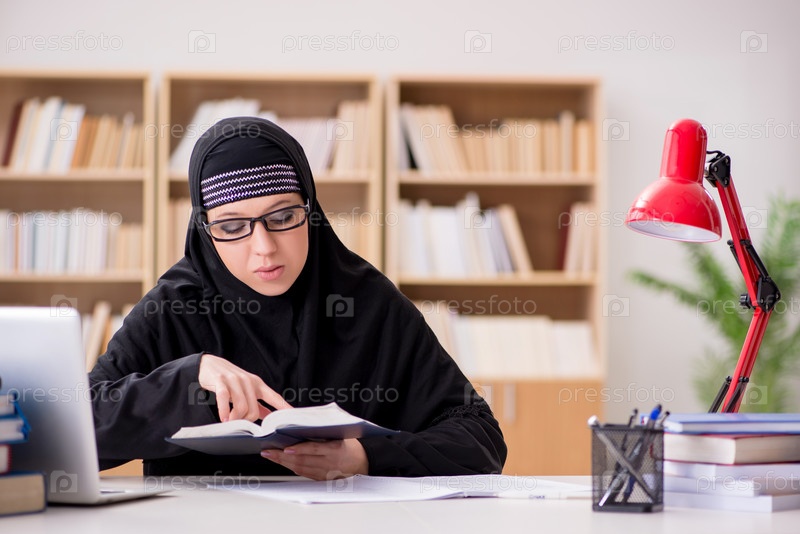 Мусульманская девушка в хиджабе учится готовиться к экзаменам