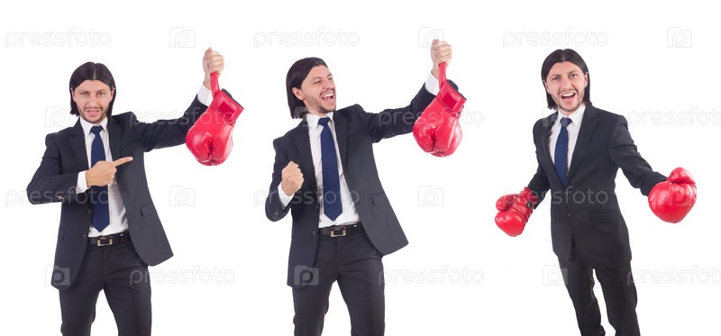 Бизнесмен с боксерскими перчатками на белом