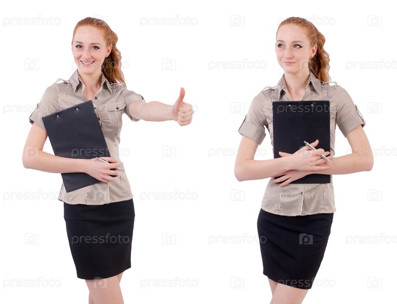 Красивая молодая сотрудница с портфелем, изолированным на белом