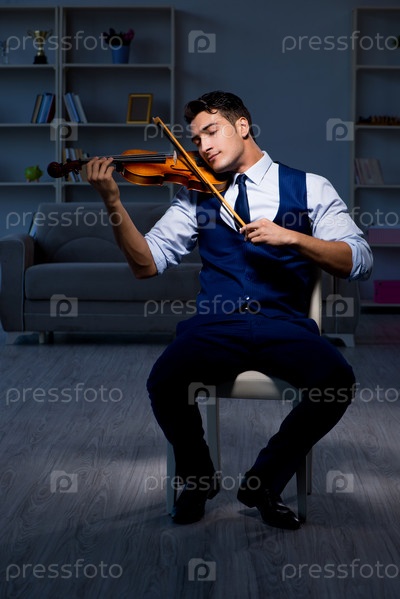 Молодой музыкант-мужчина практикуется играть на скрипке дома