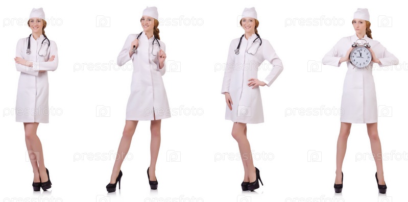 Привлекательная женщина-врач со стетотом, изолированным на белом