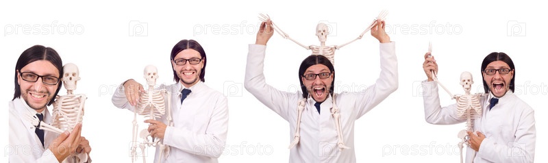 Забавный учитель со скелетом, изолированным на белом