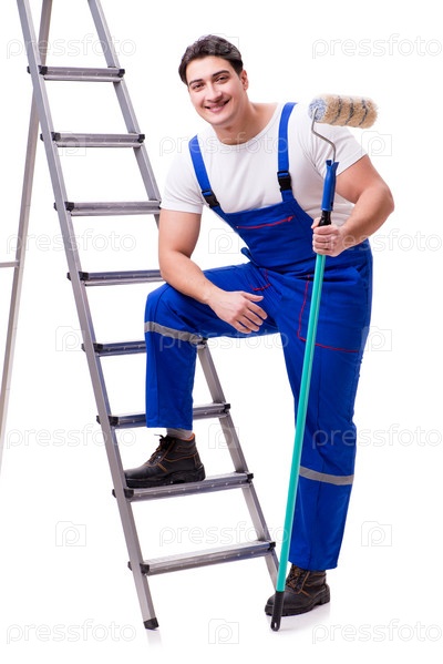 Молодой художник с лестницей, изолированной на белом фоне