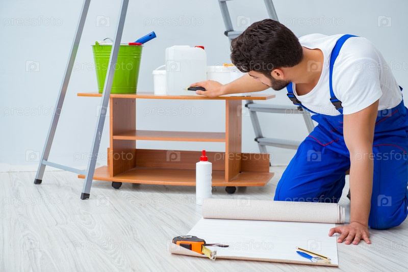 Ремонтник, выполняющий ремонтные работы в доме с бумажной оболочкой