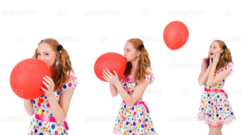 Молодая женщина с красным воздушным шаром изолирована на белом