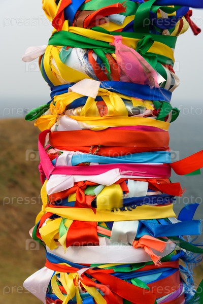 Деревянные ритуальные столбы с красочными лентами Хадак на мысе Бурхан. Озеро Байкал. Остров Ольхон