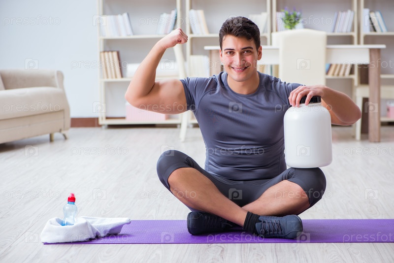 Мужчина с пищевыми добавками в спорте и концепции здорового образа жизни