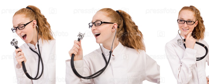 Красивая женщина-врач со стетоскопом, изолированным на белом