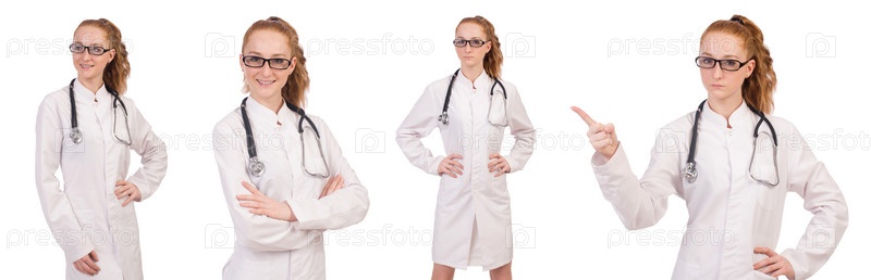 Красивая женщина-врач со стетоскопом, изолированным на белом
