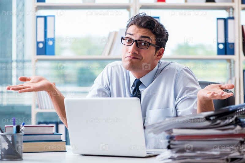 Бизнесмен с чрезмерной рабочей бумажной работой, работающий в офисе