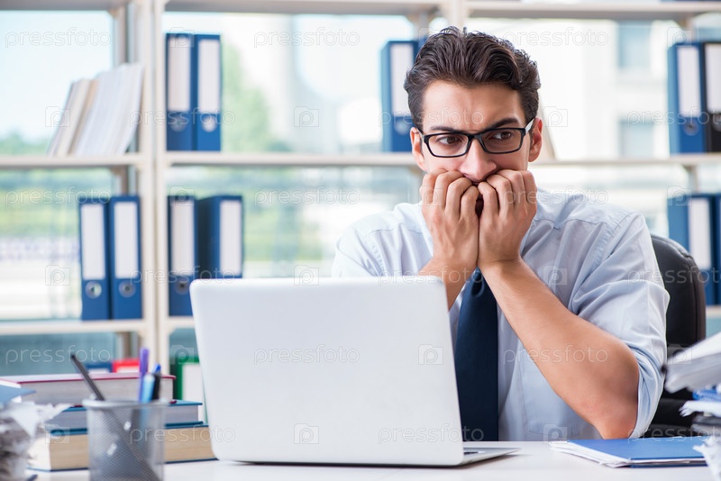 Бизнесмен с чрезмерной рабочей бумажной работой, работающий в офисе