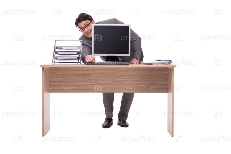 Бизнесмен прячется в офисе, изолированном на белом