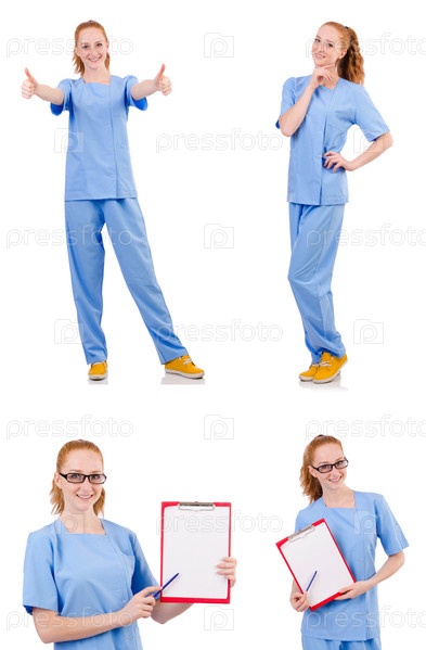Красивый доктор в синей форме изолирован на белом