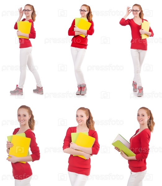 Молодая студентка с книгами на белом